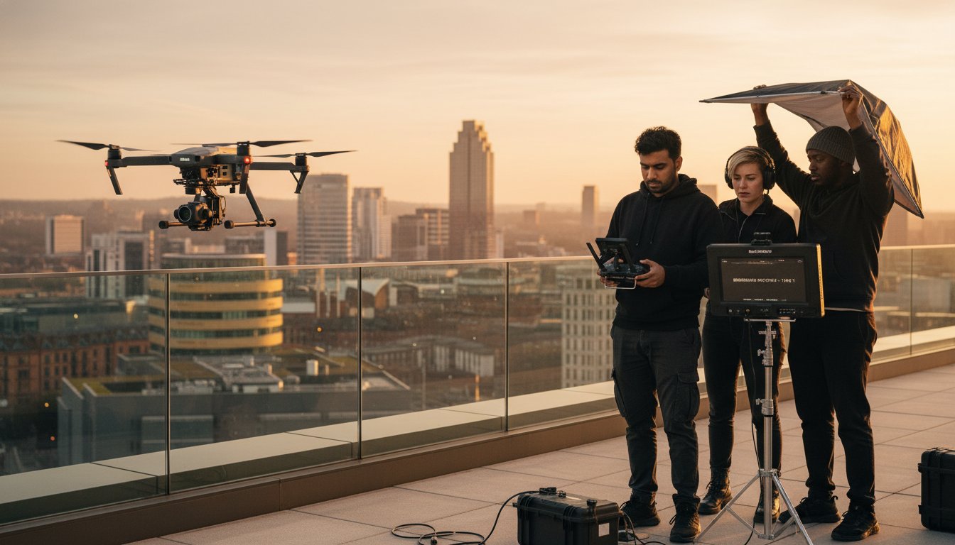 Filming in dense urban environments like Birmingham city centre or the Jewellery Quarter presents unique challenges. We regularly liaise with the West Midlands Police and Birmingham City Council to secure the necessary permissions for low-altitude filming. Public safety is managed through strict operational protocols, including: